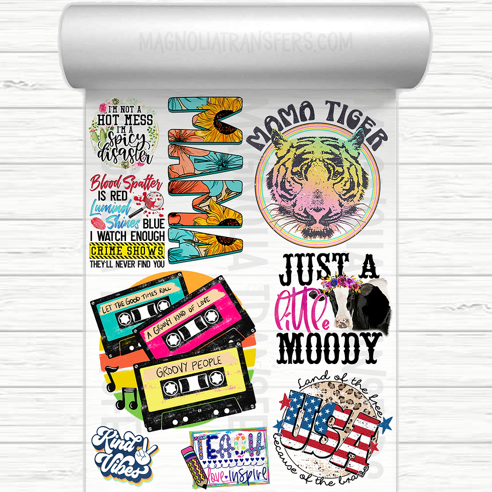 DTF bedrucktes Gang Sheet mit Logo oder Design ist eine großartige Möglichkeit, Ihre Kleidung oder Arbeitskleidung zu kennzeichnen. Ganz gleich, ob Sie an einer Fachveranstaltung, einem Festival oder einem Markt teilnehmen, Ihr individuelles Markenbanner zeigt Ihrem Publikum, mit wem es zu tun hat.